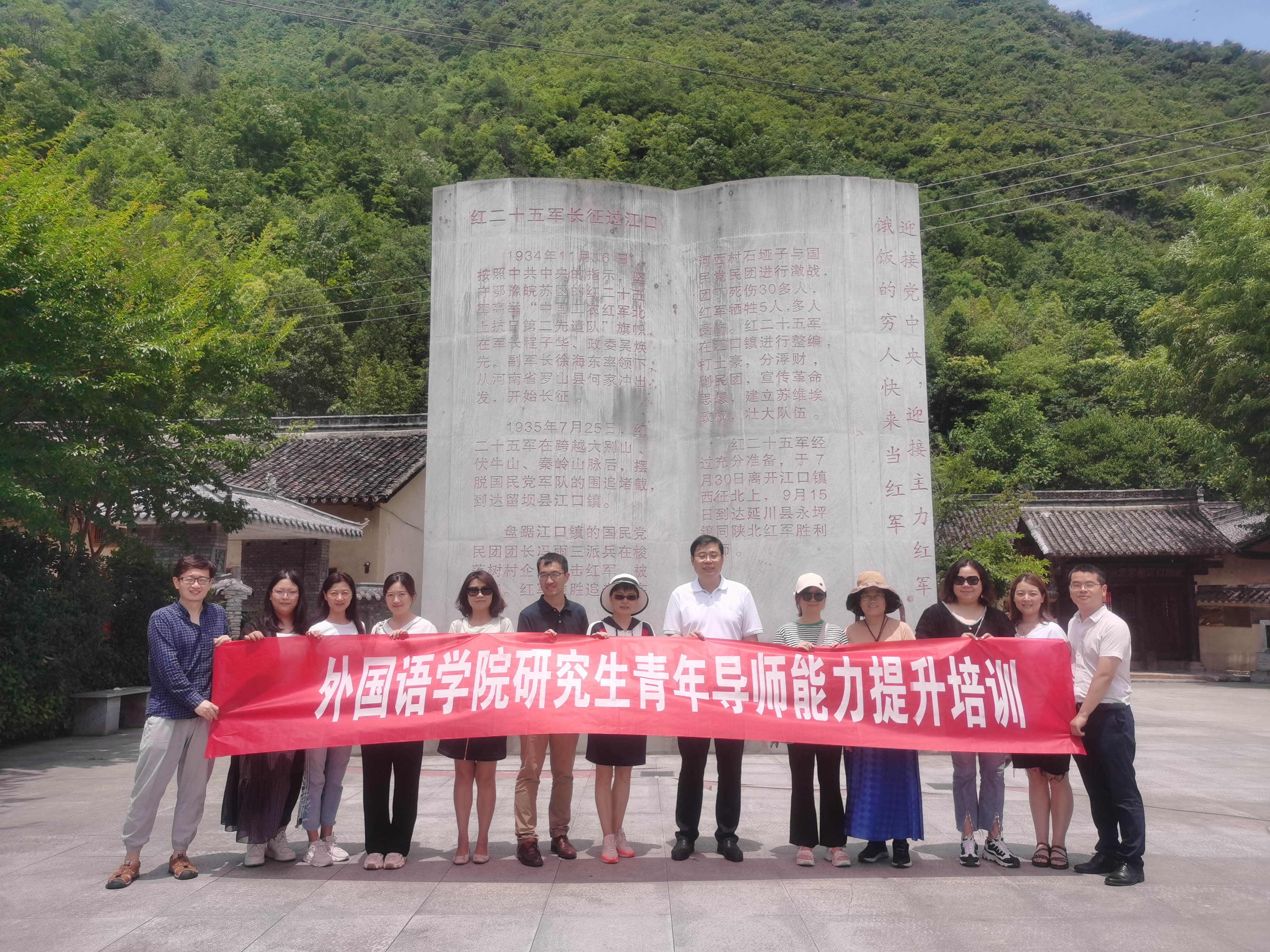 7月1日,经过近5个小时的车程终抵达目的地,稍作休整之后便前往本次培训的第一站——留坝江口红二十五军军部旧址和红二十五军烈士陵园。在这里,老师们对红二十五军的历史背景和作战事迹做了详细了解,学习了先辈们浴血奋战的革命精神,并面向红二十五军纪念碑进行缅怀;同时在院长助理王晓丹的带领下,面向党旗重温入党誓词。